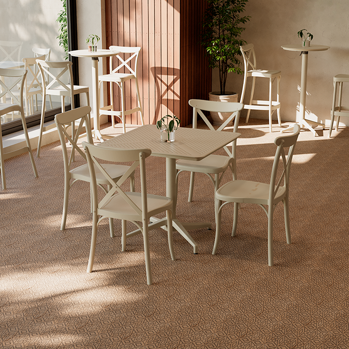 La silla Capri es resistente y versátil, fabricada en polipropileno inyectado con fibra de vidrio para un uso duradero en interiores y exteriores. Cuenta con tapones antideslizantes en PVC natural, es ligera, fácil de limpiar y se adapta a espacios de hospitalidad, oficinas o áreas sociales.