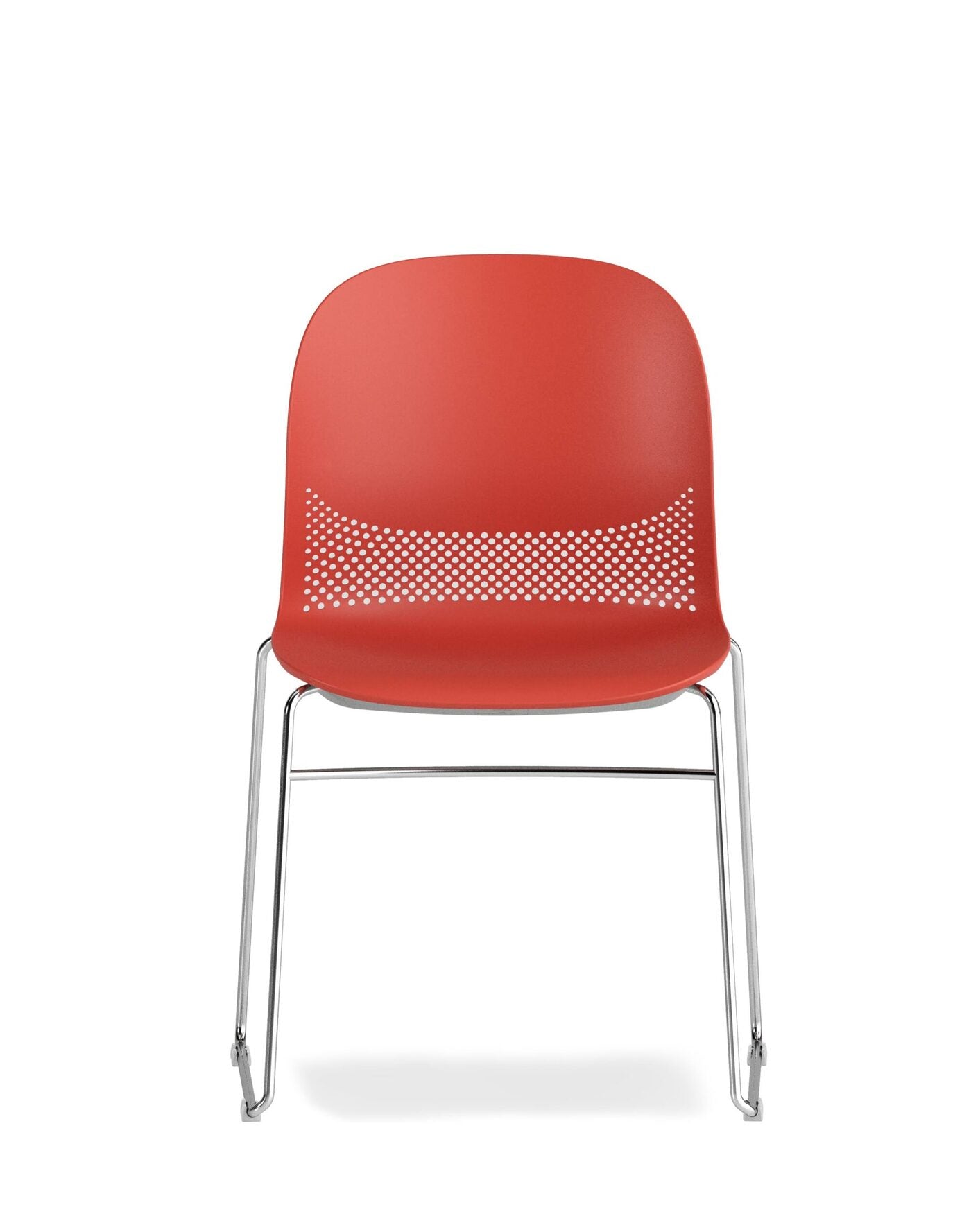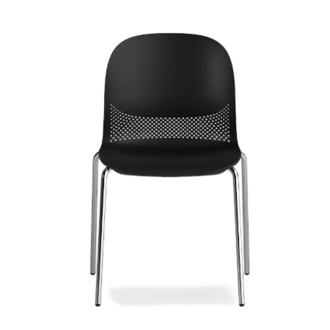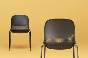 Su distintiva perforación entre el asiento y el respaldo aporta ligereza visual, proyectando sombras dinámicas que realzan su carácter contemporáneo.
