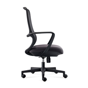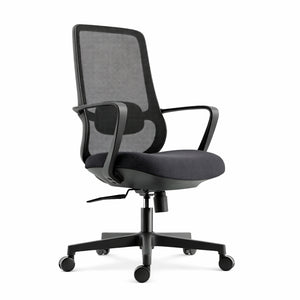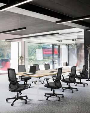 Su estructura ligera incorpora soporte lumbar ajustable, reclinación hasta 140° y malla transpirable, brindando comodidad y frescura durante la jornada.